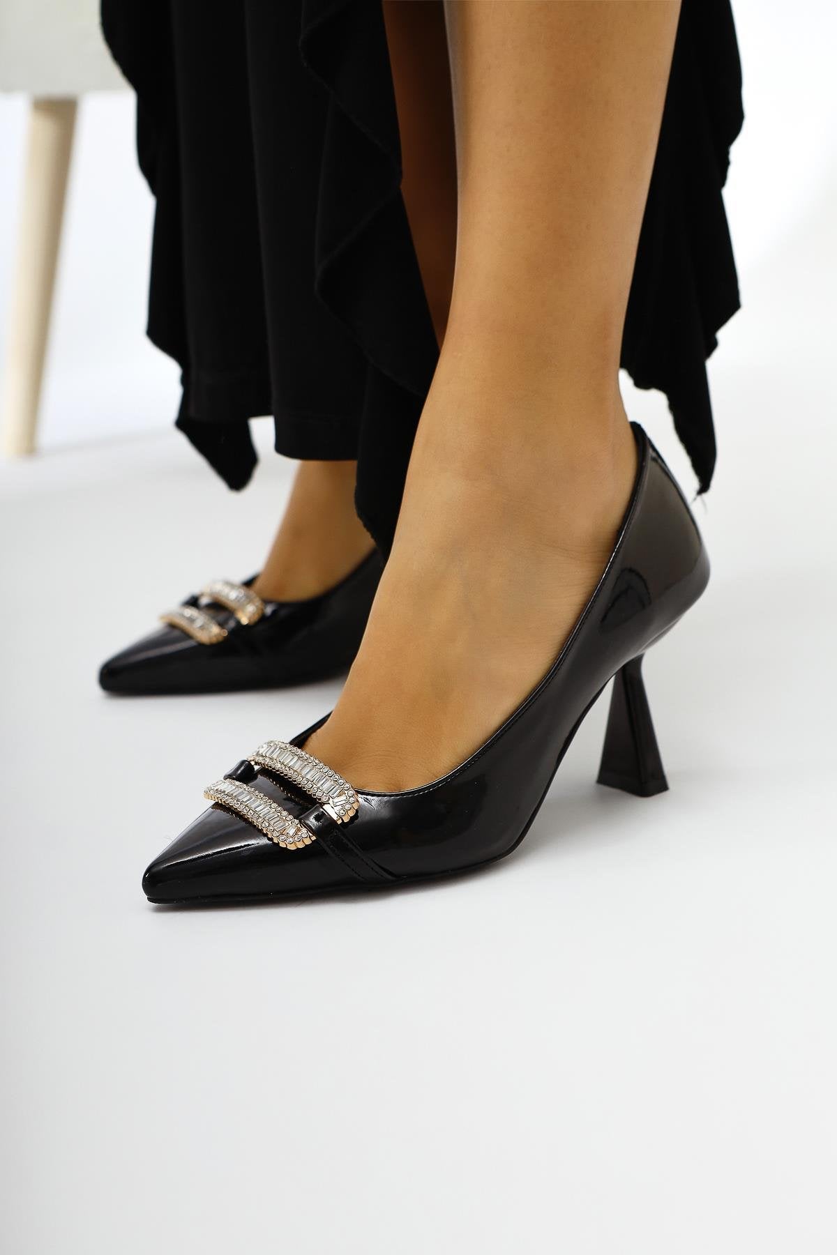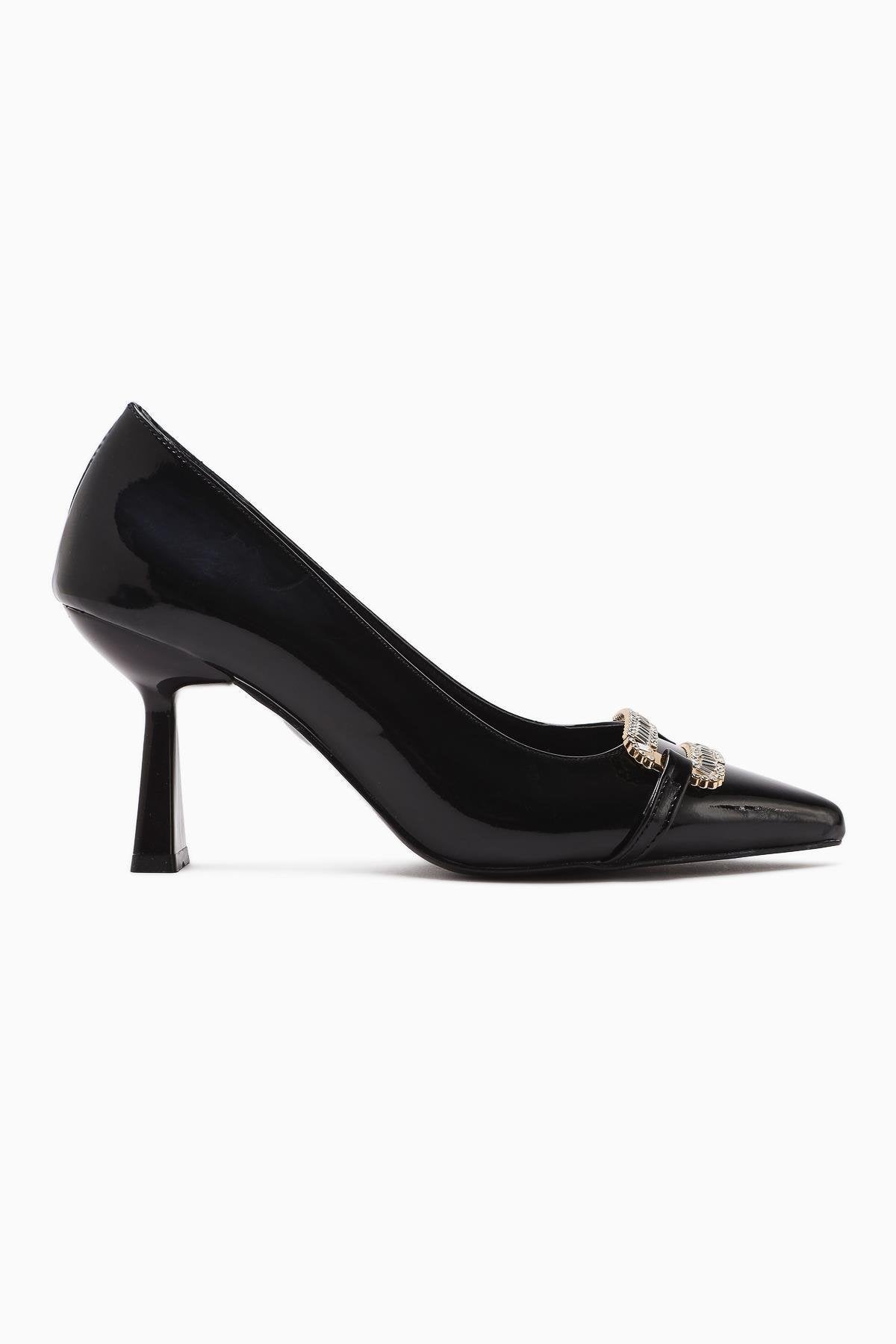 Ania Black Patent Pointed Toe Women's Heels with Rhinestone Buckle Detail
