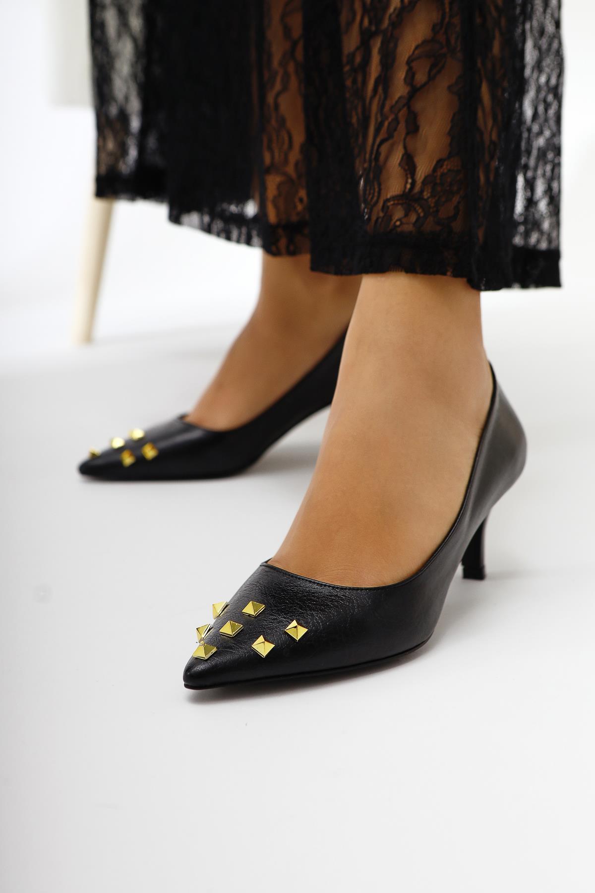 Anni – Black Crinkled Patent Pyramidal-Studded Heeled Shoe (Women)