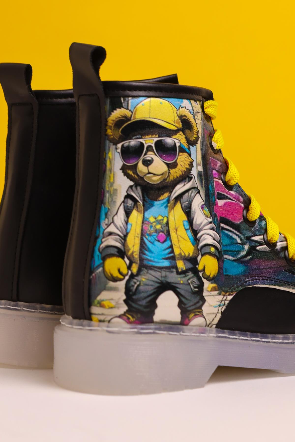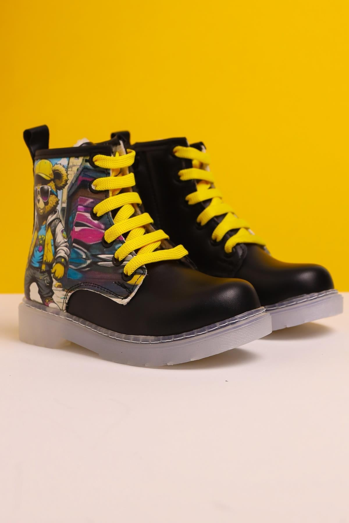 Denis Black Striped Character Print Lace-Up Kids' Boots