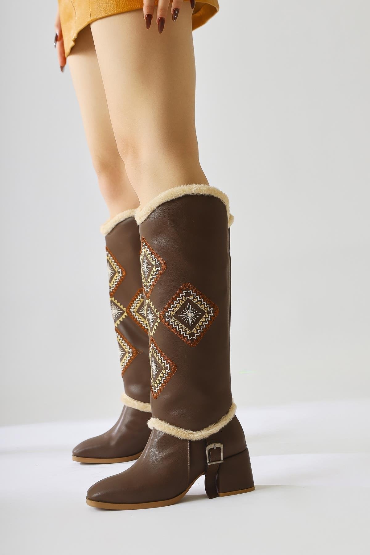Hilka Brown Removable Shaft Ethnic Patterned Boot-Bootie