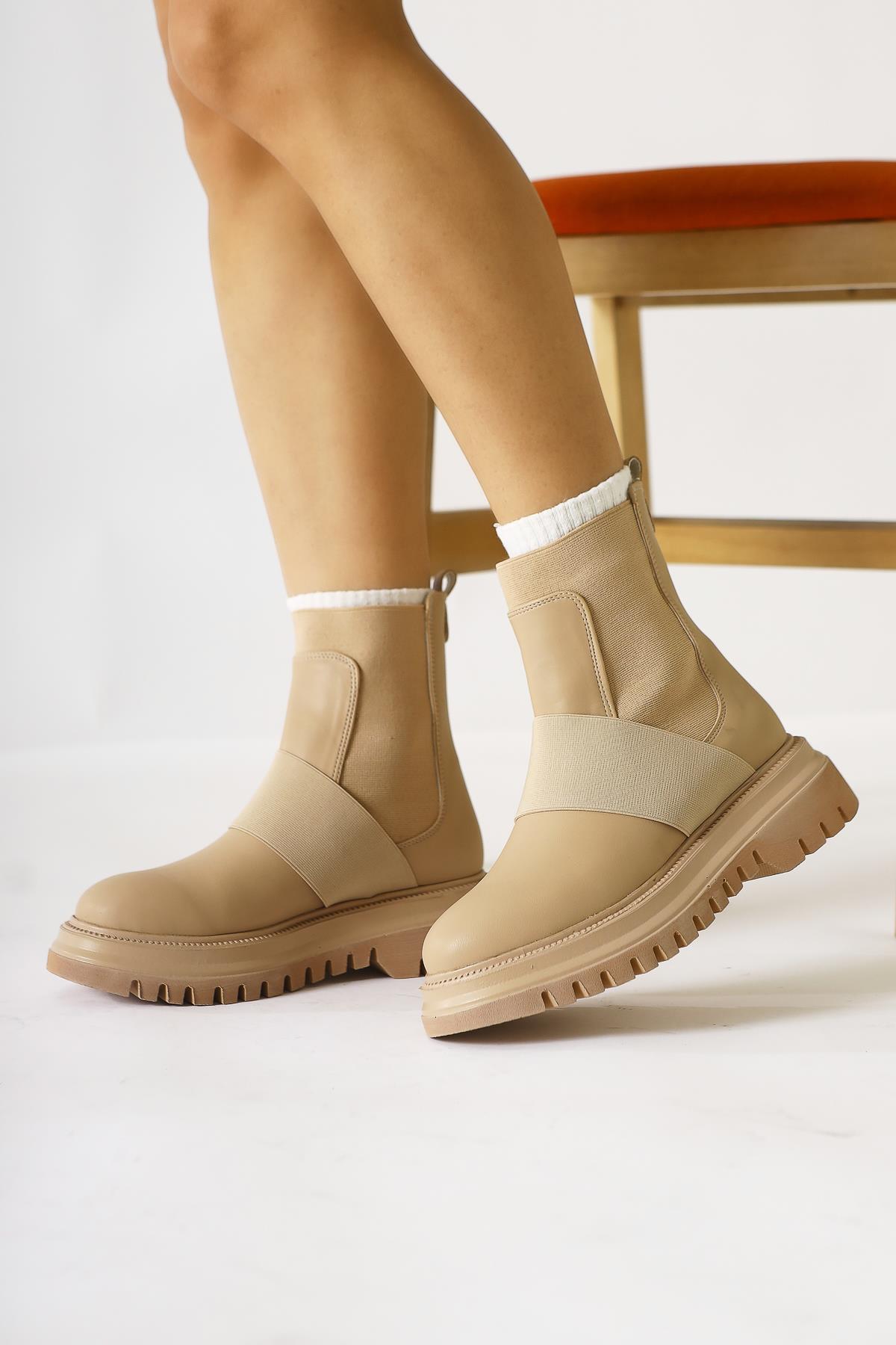 Millena Nude Elastic Belt Detailed Pull-On Women's Boot