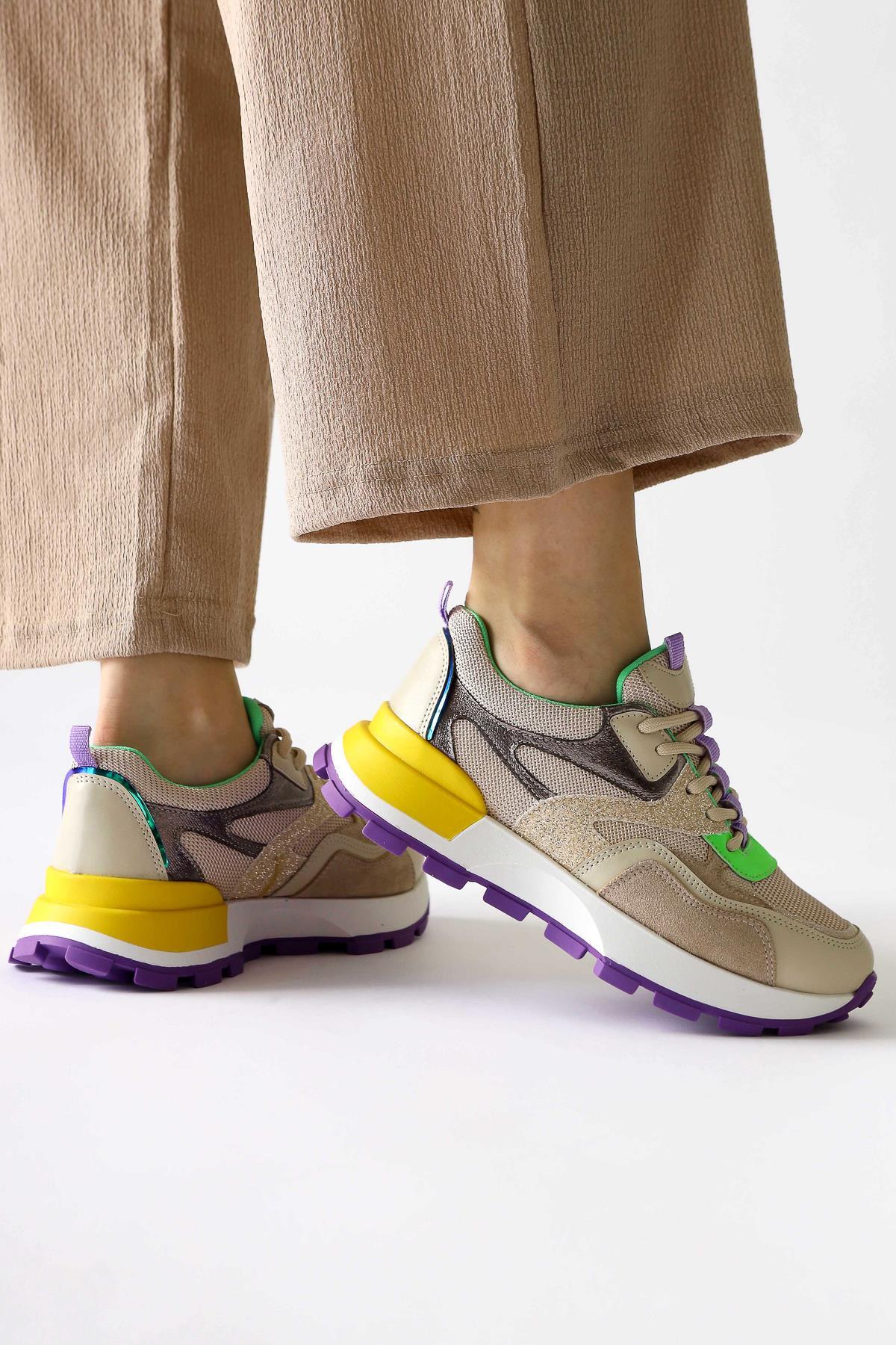 Netta Multicolor (Green) Mesh Detailed Lace-Up Sneakers