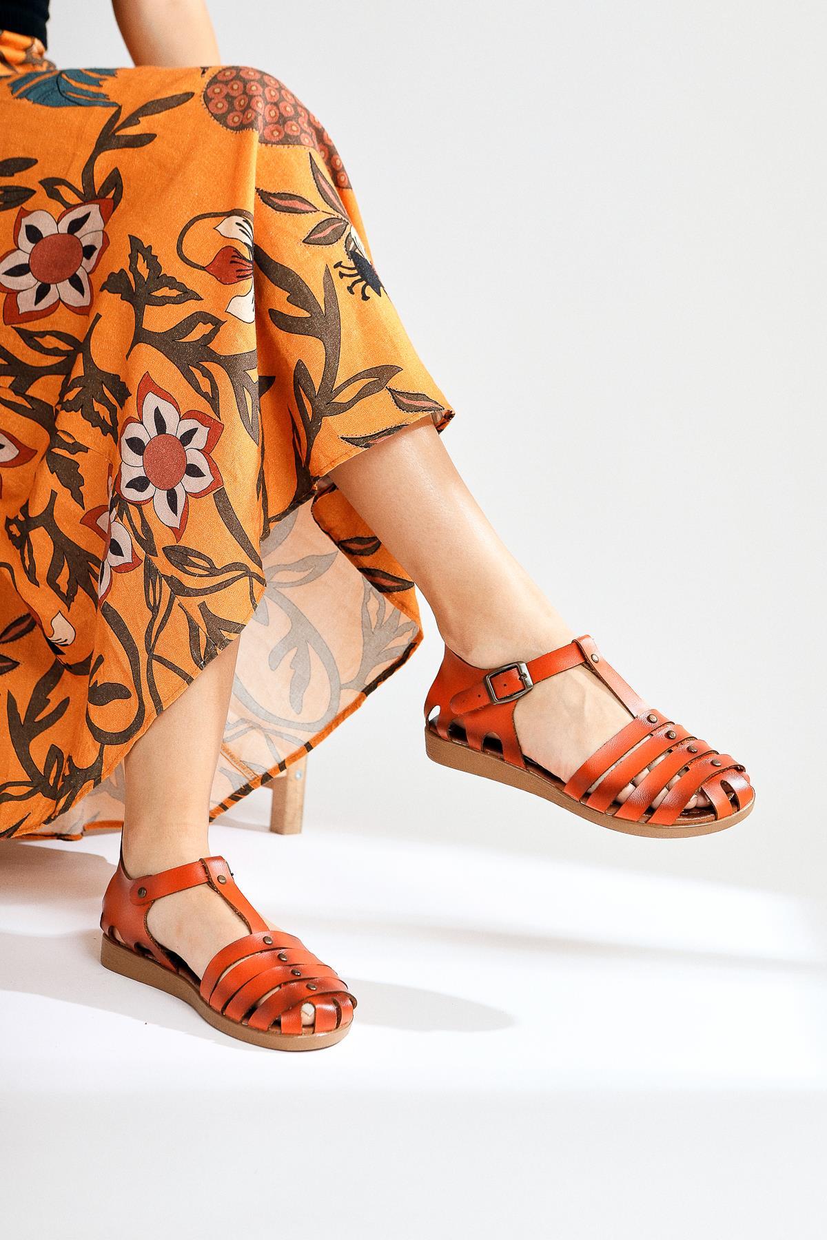 Tori Genuine Leather Orange Four-Strap Adjustable Flat Sandals